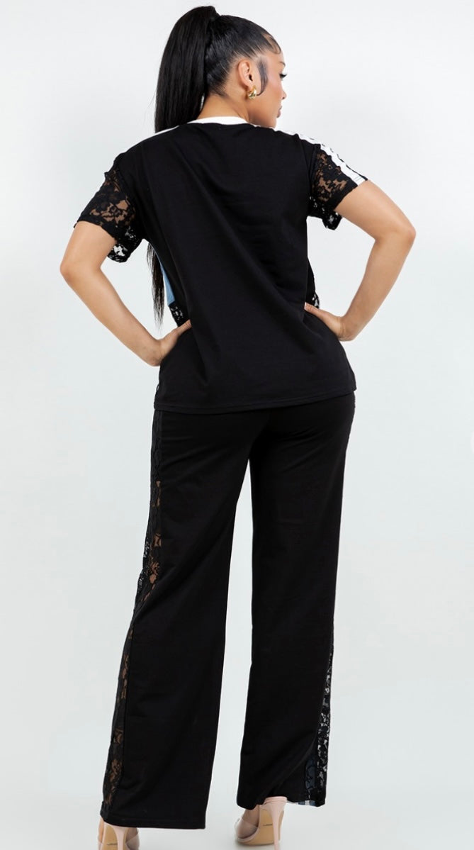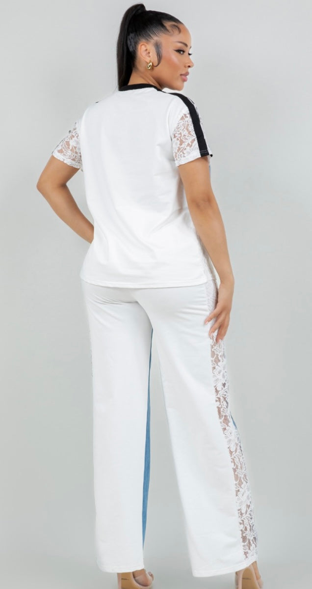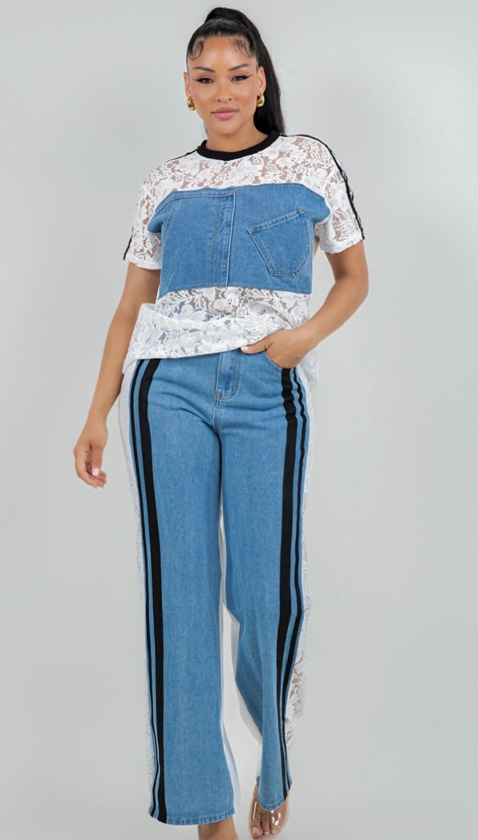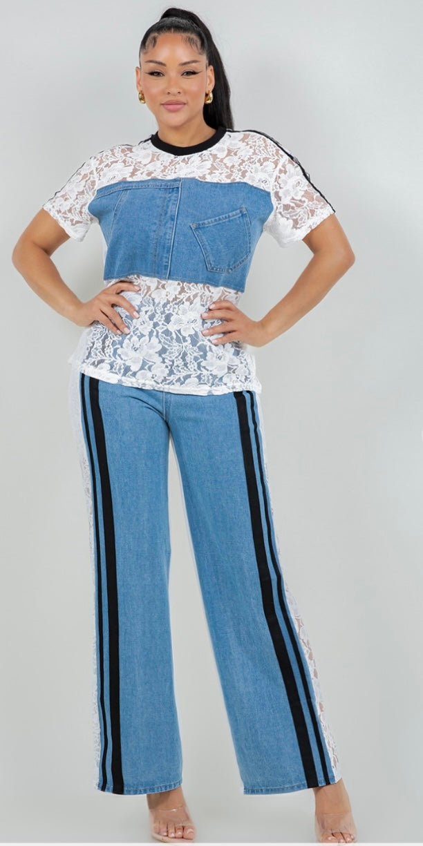 Two pieces lace and denim pants set strech 75%Polyester 25% cotton